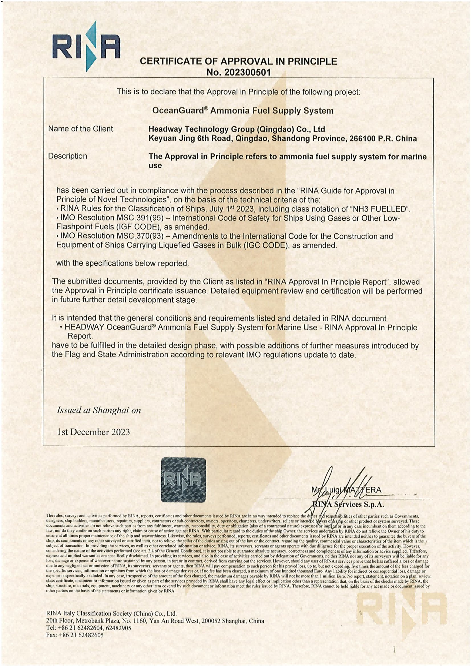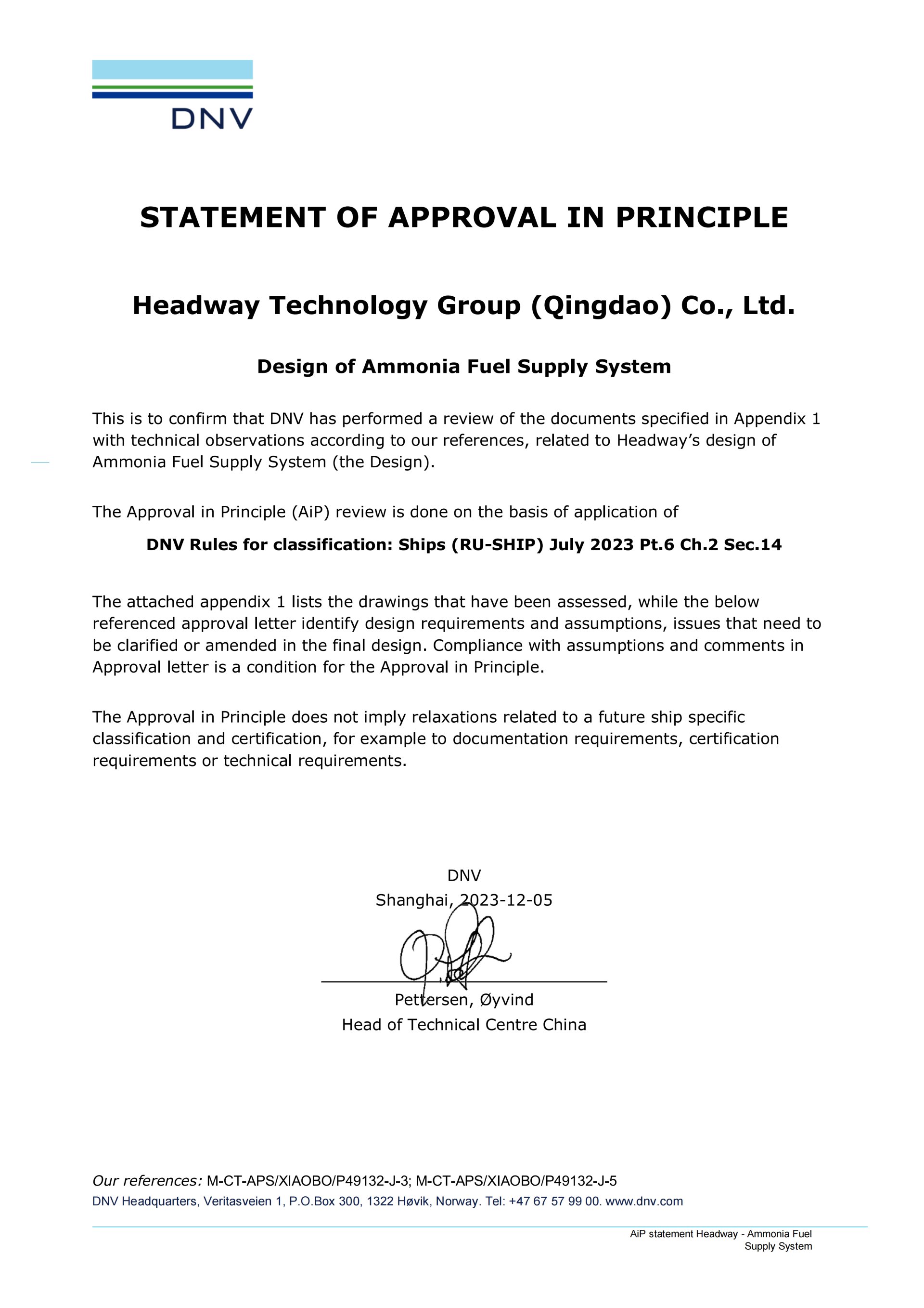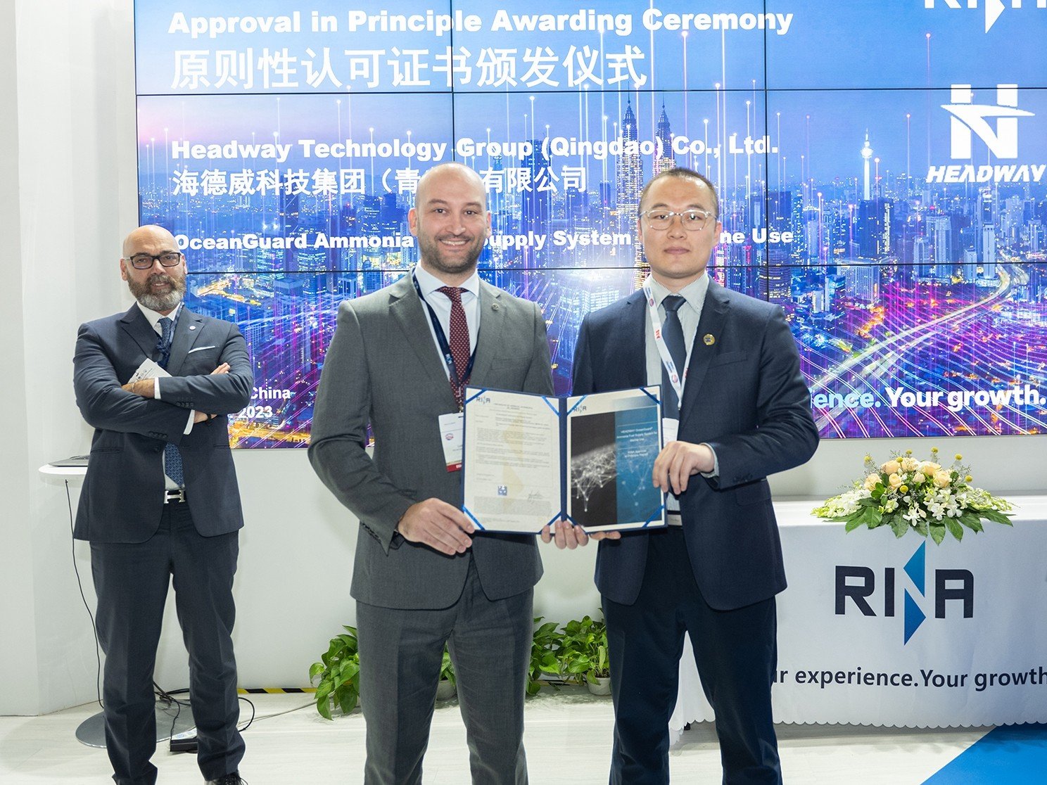 2023年中國國際海事會展上,海洋衛(wèi)士?氨燃料供給系統(tǒng)正式取得DNV船級社和RINA船級社授予的原理認(rèn)可證書,標(biāo)志著海德威低碳航運(yùn)產(chǎn)品生態(tài)再度擴(kuò)軍并取得業(yè)界權(quán)威認(rèn)可。